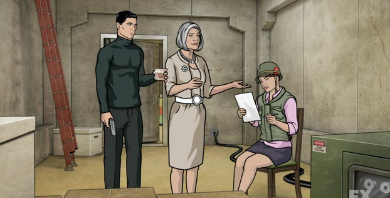 - In "Tragical History," Lana, Archer, Malory and Doctor Krieger attempt to get into the vault to turn off the backup server. Unfortunately the server that opens the door is infected by the virus so they can't access it.
