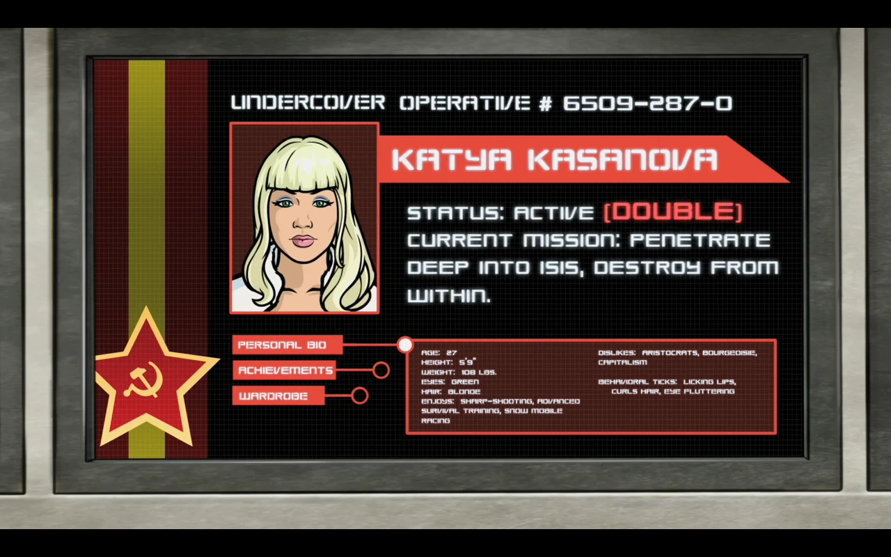 It is later revealed that Katya saved Sterling Archer's life on one condition—that he bring her home to America with him. Archer agreed and brought her to meet his mother Malory Archer. The two are about to have sex in Malory's office, only for her to walk in on them. Once the rest of the ISIS staff have been introduced to Katya, she immediately stirs their suspicion (mostly from Malory and Lana Kane) and these suspicions only become more intense when she pays special attention to Dr. Algernop Krieger's "special project".