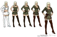 She dresses in a highly impractical way considering the climate of Russia, wearing only a micro corset and mini-skirt combo, a stylish jacket with a Kosak-style hat and white thigh-high boots (her preference for white thigh-high boots contrasts with Lana Kane's black thigh-high boots).