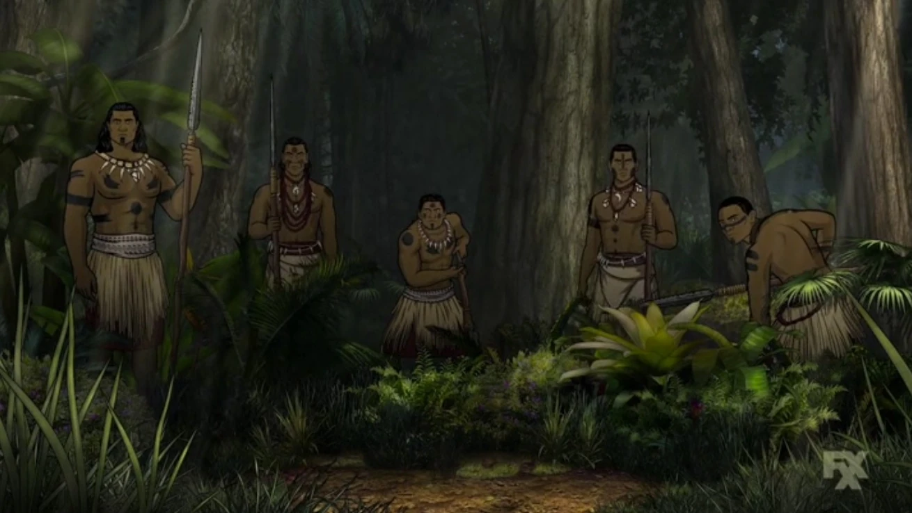 According to Archer's description, the jungle contains "nothing but danger - [it] is stuffed to the tits with quick sand, ferocious baboons, poisonous snakes, poisonous frogs, cannibals (mua mua), dragons (extremely big lizards)".