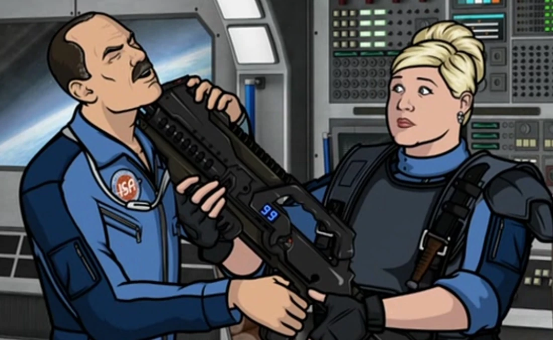 The launch is interrupted by Barry, who, unable to get through the door to Intrepid, challenges Archer to a battle. His teasing and the offer to have Archer use Spacebot to fight him are nearly successful. It is Cheryl (the most self-centered ISIS employee) pointing out that Archer is being incredibly selfish with his desire to open the door, which will probably result in all their deaths, that stops him.